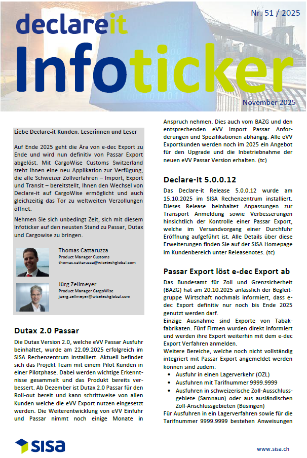 Mit dem Declare-it Infoticker sind Sie stets auf dem Laufenden über die neusten Entwicklungen in der elektronischen Verzollung. Der Infoticker erscheint 3-4 x jährlich.