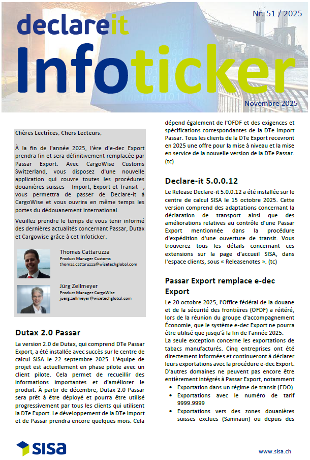 Avec l'Infoticker Declare-it vous êtes toujours à jour sur les derniers développements dans le dédouanement électronique. L'infoticker apparaît 3-4 fois par an. Abonnez-vous à l'infoticker avec le formulaire d'inscription ci-dessous.