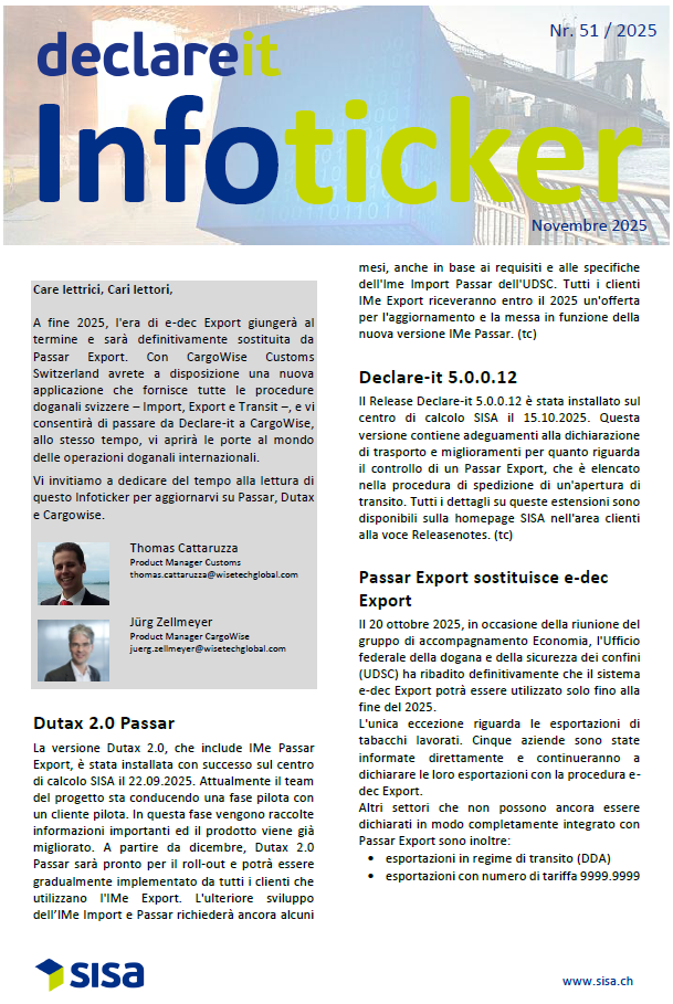 Con l'Infoticker Declare-it siete sempre aggiornati sugli ultimi sviluppi per quanto riguarda lo sdoganamento elettronico. L'Infoticker appare 3-4 volte all'anno. Iscriviti all'Infoticker qui!